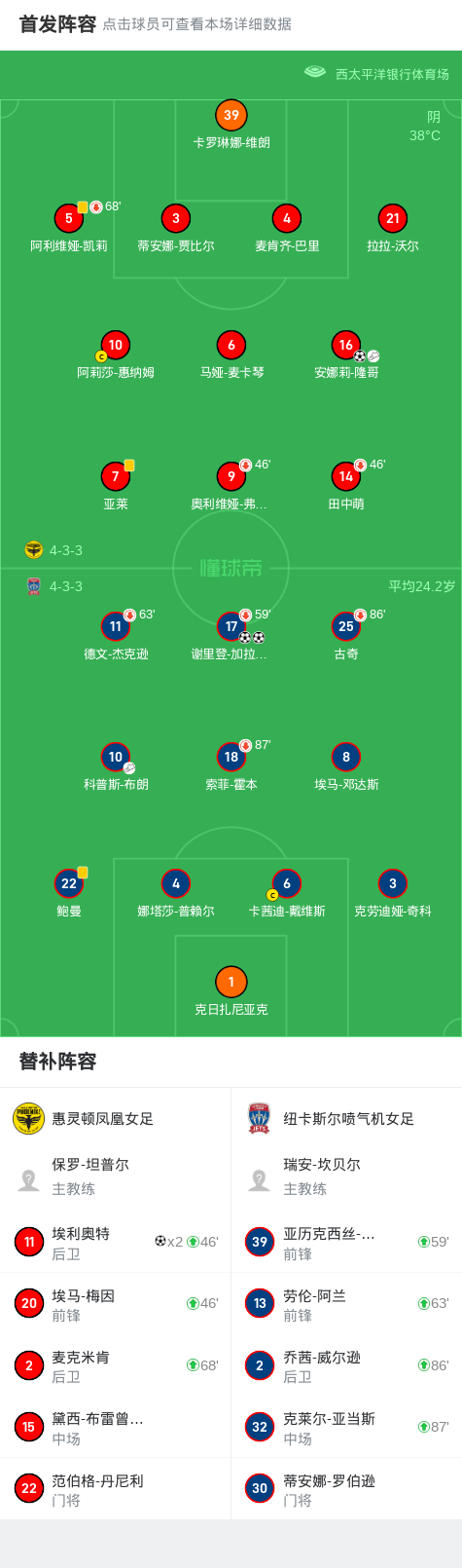 在澳大利亚女子足球W联赛第12轮的比赛中,惠灵顿凤凰女足坐镇主场迎战纽卡斯尔喷气机女足。比赛一开始,纽卡斯尔喷气机女足的谢里登-加拉格尔便迅速为球队取得领先。随后,她在科普斯-布朗的助攻下,再次攻破对方球门,帮助纽卡斯尔喷气机女足扩大优势。 然而,惠灵顿凤凰女足并未气馁。安娜莉-隆哥展现出色的组织能力,助攻埃利奥特扳回一城。紧接着,安娜莉-隆哥亲自破门,将比分扳平。比赛进入尾声阶段,埃利奥特再次挺身而出,为惠灵顿凤凰女足打入制胜一球。 最终,惠灵顿凤凰女足凭借埃利奥特的两粒进球和安娜莉-隆哥的出色表现,以3-2逆转战胜纽卡斯尔喷气机女足,取得了这场激动人心的胜利。