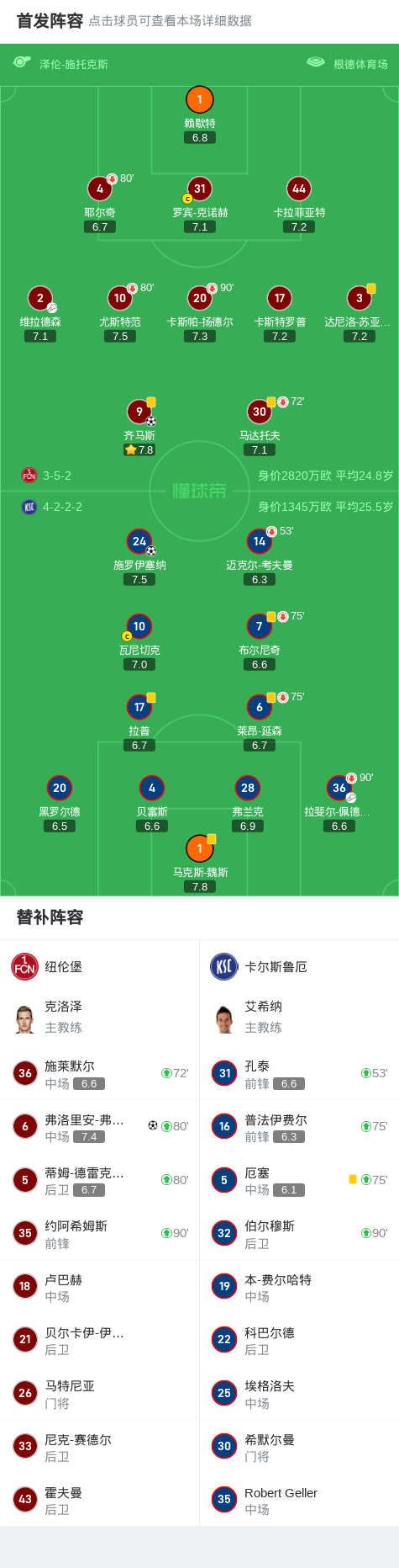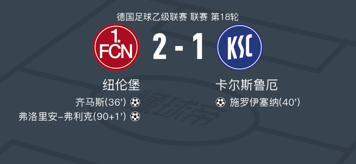 纽伦堡2-1卡尔斯鲁厄,弗洛里安-弗利克、齐马斯破门