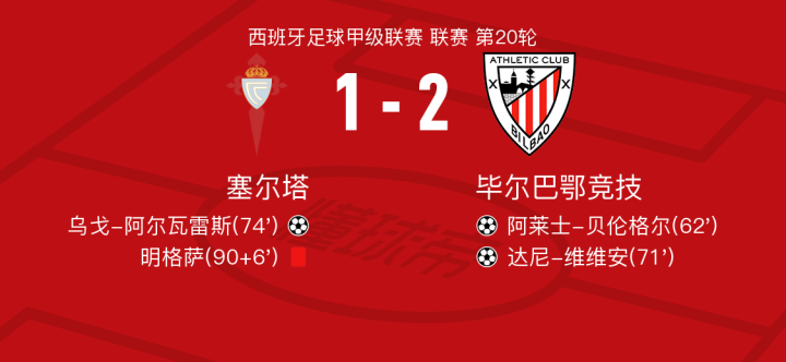 塞尔塔vs毕尔巴鄂竞技球员评分:德加拉雷塔7.8分,德马科斯5.7分