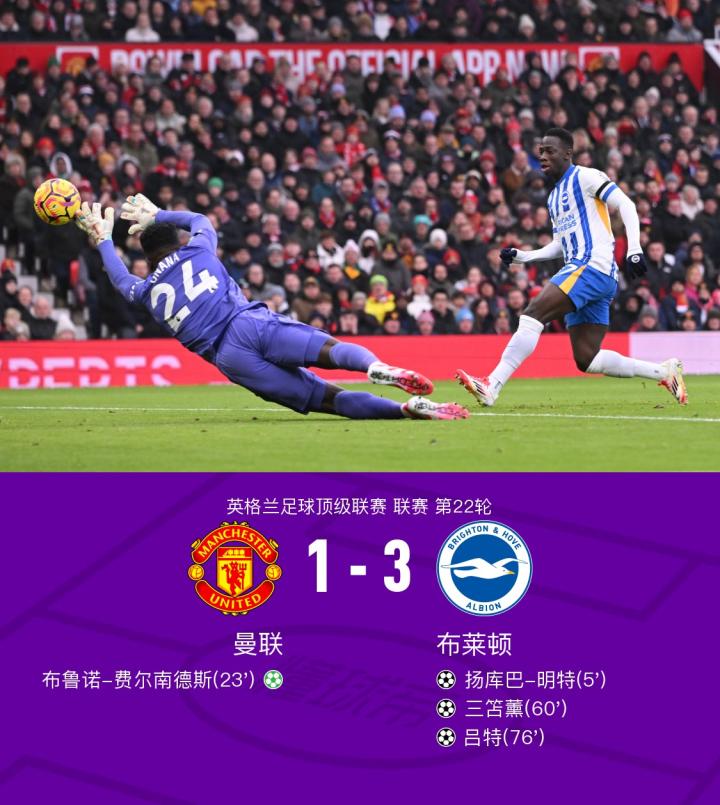 北京时间1月19日22:00,英超联赛第22轮,曼联主场迎战布莱顿。上半场,三笘薰助攻明特开场闪击,随后齐尔克泽造点,B费点射破门扳平比分。明特身后放铲达洛特没有被吹犯规惹争议,达洛特关键封堵;下半场,若昂-佩德罗进球因范黑克犯规在先被吹无效,但曼联终究还是再度丢球,明特投桃报李助攻三笘薰抢射得手,随后奥纳纳扑救出现超巨失误,替补登场的吕特笑纳大礼。最终曼联主场1-3不敌布莱顿,本赛季遭对方双杀。