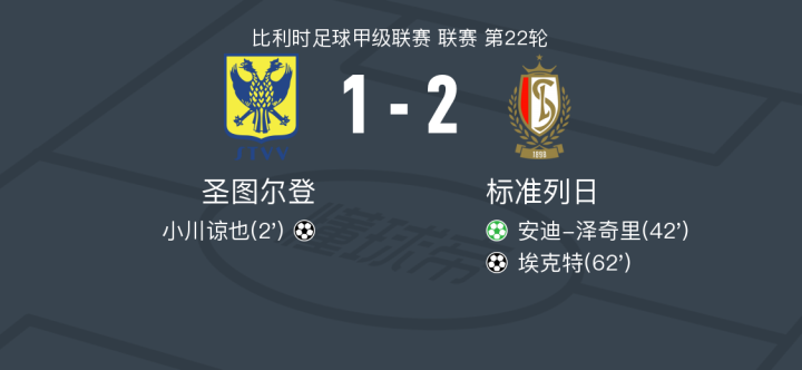 在比利时足球甲级联赛第22轮的较量中,圣图尔登坐镇主场迎战标准列日。比赛伊始,圣图尔登的球员小川谅也率先为主队取得领先。然而,标准列日迅速调整,安迪-泽奇里通过点球为客队扳平比分。随后,埃克特再度为标准列日建功,帮助球队反超。最终,圣图尔登以1-2不敌标准列日,客队成功带走胜利。