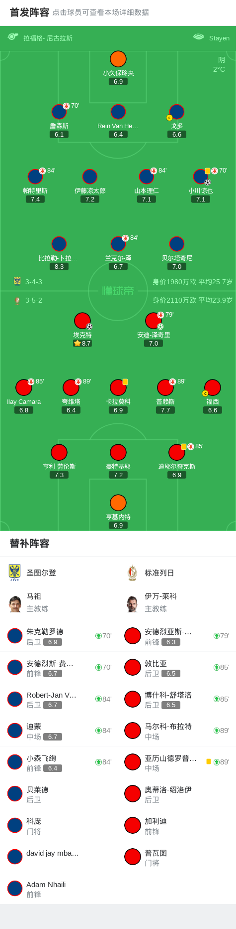 第2分钟,圣图尔登球员小川谅也打入一球。