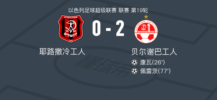 贝尔谢巴工人2-0耶路撒冷工人,康瓦建功,佩雷茨锁定胜局