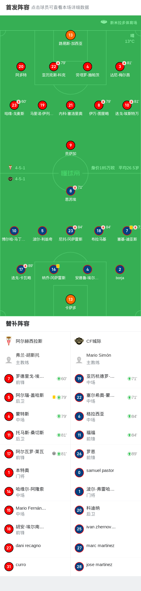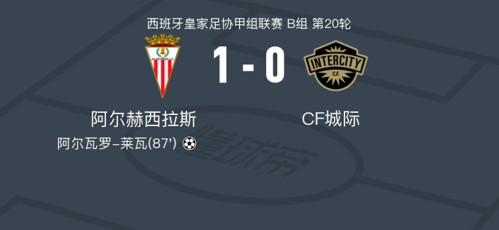 在西班牙皇家足协甲组联赛B组第20轮的比赛中,阿尔赫西拉斯坐镇主场迎战CF城际。比赛中,阿尔赫西拉斯的阿尔瓦罗-莱瓦成功破门,为球队取得领先。最终,阿尔赫西拉斯以1-0战胜CF城际,取得了本场比赛的胜利。