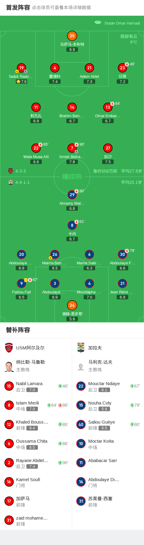 下半场补时第9分钟,USM阿尔及尔球员Rayane Abdelmadjid Mahrouz助攻Saâdi Radouani打入一球。