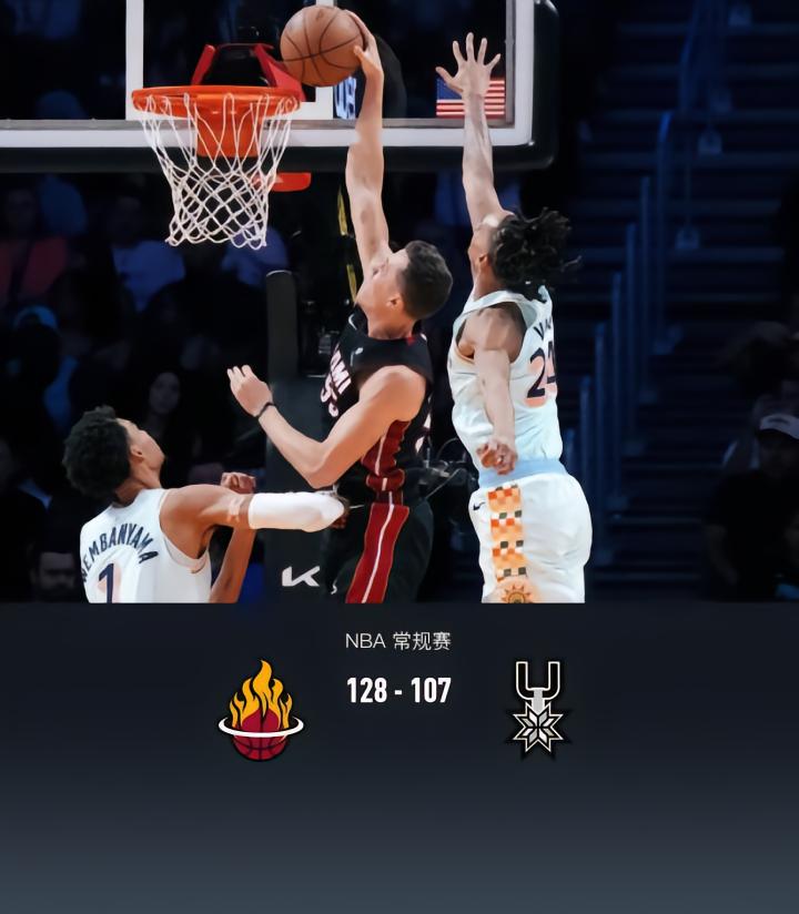 第四节热火凯尔-韦尔拿下10分,马刺克里斯-保罗拿下10分,最终热火128-107战胜马刺