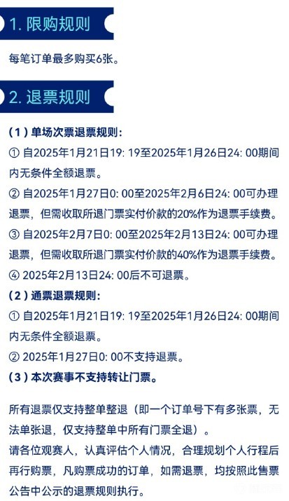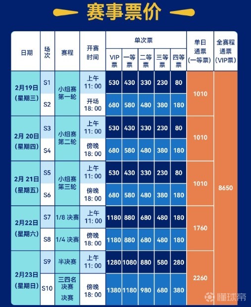 全赛程通票:指的是2月19日-23日五天全赛程通票,每张全赛程通票包含本赛事所有场次的VIP票,且固定座位。购买通票的观众在观看每一场比赛后,必须同步退场,经票务核验再次入场。