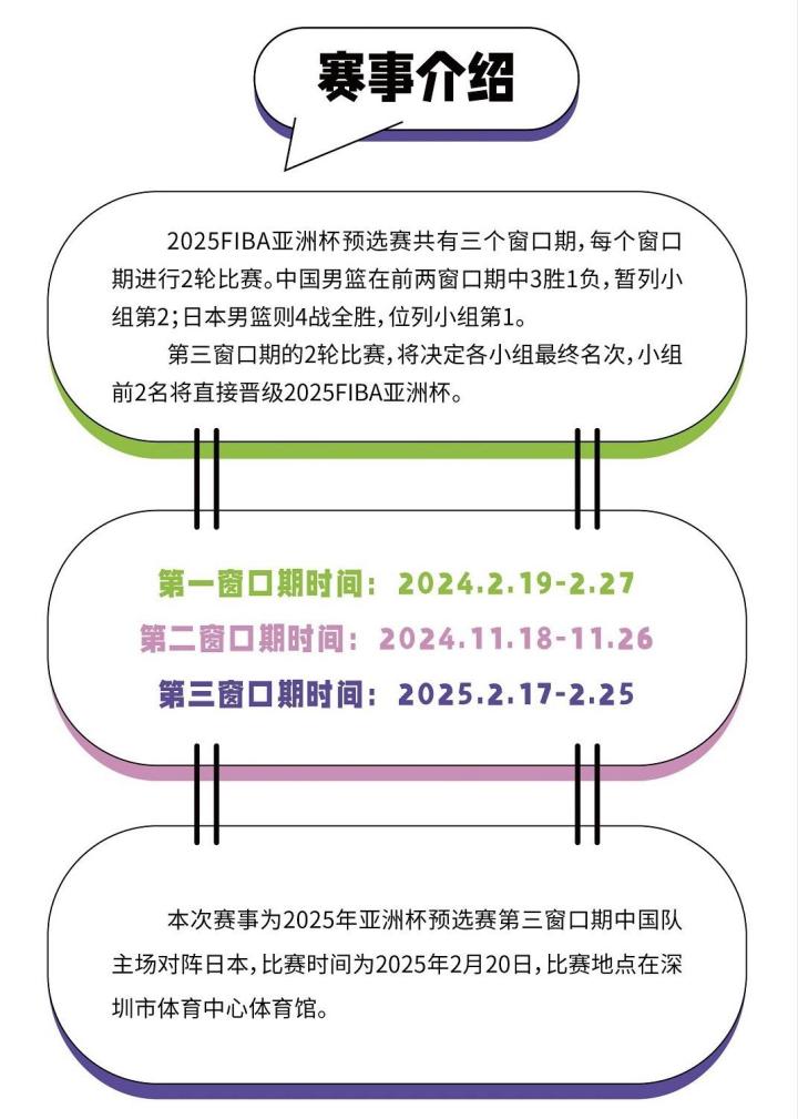 2025年2月20日,中国男篮将在深圳迎战日本男篮,这将是本届预选赛中国男篮第二次与日本交手。在第一窗口期,中国男篮客场以73-76惜败日本,这也是中国男篮88年来首次在FIBA体系中负于日本。