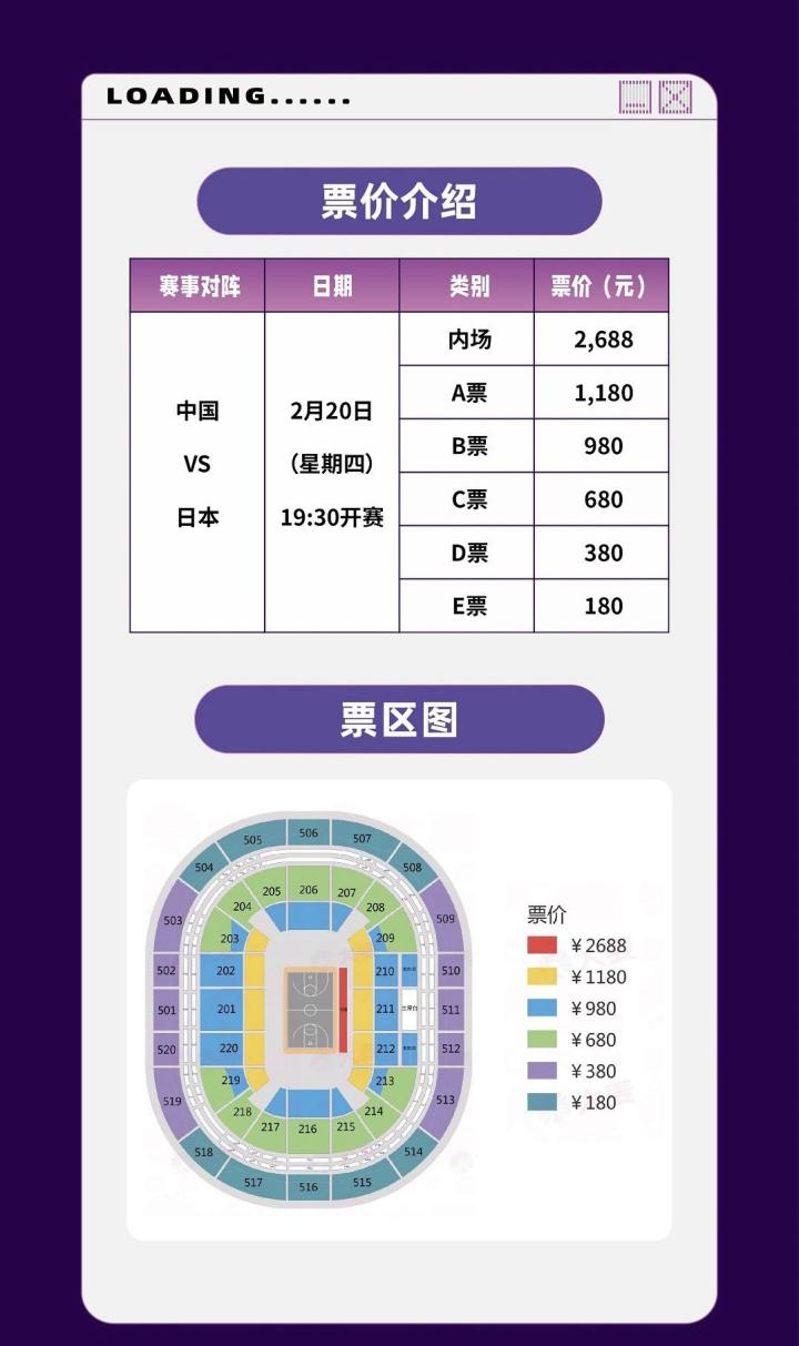 亚预赛中国男篮vs日本二番战票价公布:最低180元,最高2688元