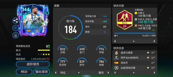 卡瓦哈尔上赛季帮助皇家马德里夺得了欧冠冠军,而在夏天的欧洲杯赛场上,他也是西班牙的冠军边后卫。在上赛季的欧冠活动中,卡瓦哈尔推出的球员卡配备了角斗士天赋,着重提升了他的加速、传中、人盯人、铲断、拦截五项数据。高级油炸丸子搭配三星花式星级让卡瓦哈尔的边路能力突破显著提升。