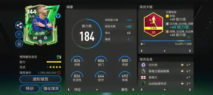 本赛季的切尔西状态有明显复苏,这与球队中前场进攻核心帕尔默的出色发挥密不可分。游戏中,此前的创始周年庆活动中,帕尔默推出了一张顶级球员卡。天赋方面,艺术家对他的加速、射门、短传、盘带、控球五项数据提升显著。花式方面,高级油炸丸子搭配四星花式星级确保了帕尔默的持球进攻能力。