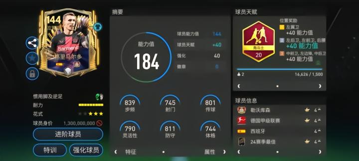 格里马尔多本年度首次进入年度最佳阵容,上赛季他帮助勒沃库森夺得德甲冠军,并帮助西班牙夺得了2024欧洲杯冠军。此前24赛季最佳活动中,格里马尔多推出的球员卡配备了角斗士天赋,对他的加速、传中、人盯人、铲断、拦截五项数据提升显著。高级油炸丸子搭配三星花式星级也确保了他的边路推进能力。