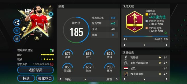 目前效力于英超豪门利物浦的萨拉赫本赛季至今已经斩获21球17助攻,并帮助利物浦保持着联赛第一排名。游戏中,此前的24赛季最佳萨拉赫实力相当强劲。天赋方面,猎鹰天赋对他的加速、射门、传中、弧线、盘带五项数据有所提升。马赛回旋搭配四星花式星级的花式配置让他的边路突破更为犀利。