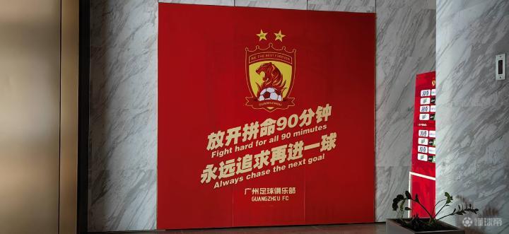 打开走廊里的灯,原本黑漆漆的墙壁上,显现出一张张广州队取得胜利、拿到冠军的历史照片。走廊尽头,一块火红的宣传画上写着两行金色的大字: