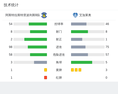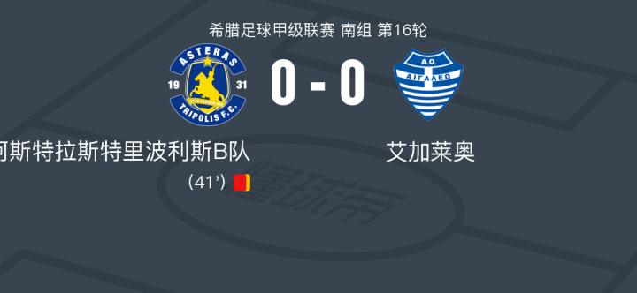 阿斯特拉斯特里波利斯B队0-0艾加莱奥,双方鏖战90分钟未分胜负战报bot @懂球帝2025-01-20 21:55在希腊足球甲级联赛南组第16轮的较量中,阿斯特拉斯特里波利斯B队坐镇主场迎战艾加莱奥。比赛中,阿斯特拉斯特里波利斯B队在一次防守中被裁判出示了第二张黄牌,场上局势一度紧张。尽管双方都在努力寻找破门良机,但最终未能改写比分,比赛以0-0的平局收场。点击查看本场比赛详细数据>>精彩瞬间第41分钟,阿斯特拉斯特里波利斯B队球队吃到第二张黄牌。 技术统计 展开更多