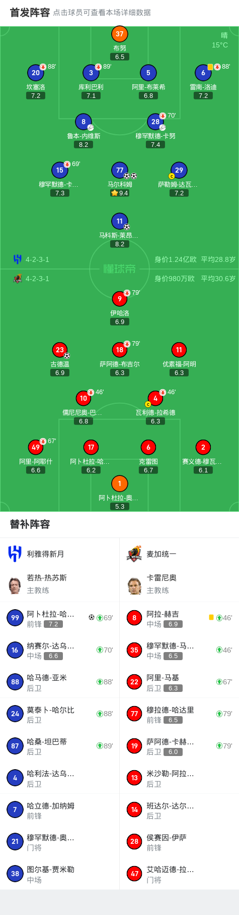 在沙特阿拉伯联赛第16轮的较量中,利雅得新月坐镇主场迎战麦加统一。上半场奥阿希尔扑救脱手,莱昂纳多补射破门,之后卡努助攻马尔科姆破门扩大比分。下半场马尔科姆破门完成双响,之后古德温开出的任意球直接转进球门,麦加统一扳回一球,随后莱昂纳多做球,哈姆丹兜射破门。最终利雅得新月4-1战胜麦加统一。