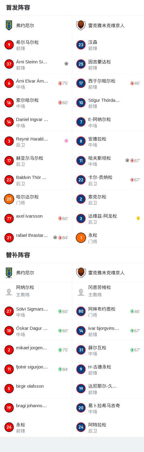 第2分钟,弗约尼尔球员rafael thrastarson助攻Árni Steinn Sigursteinsson打入一球。