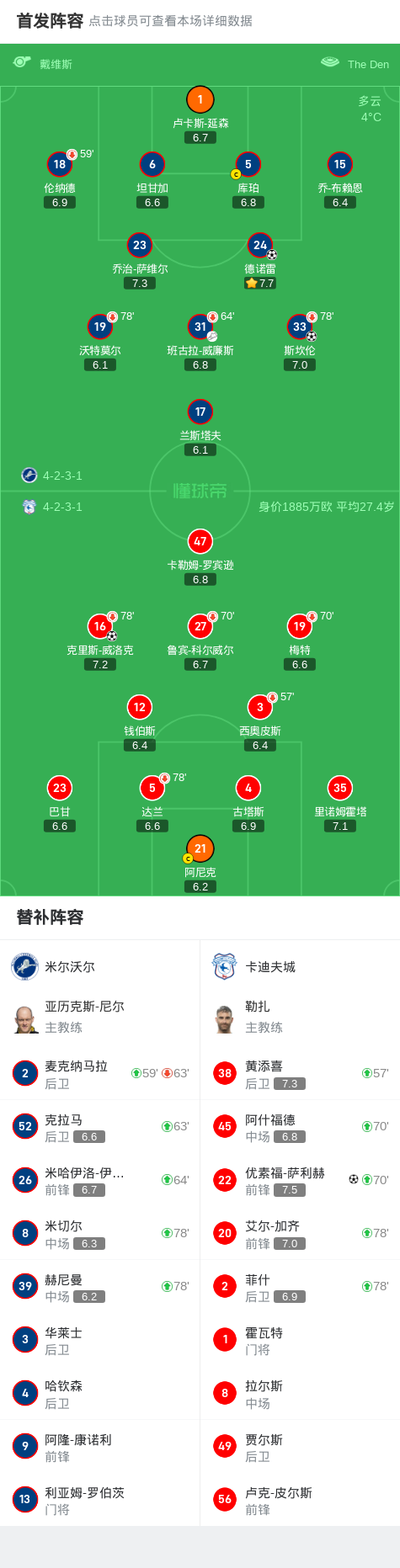 米尔沃尔2-2卡迪夫城,斯坎伦破门,优素福-萨利赫救主