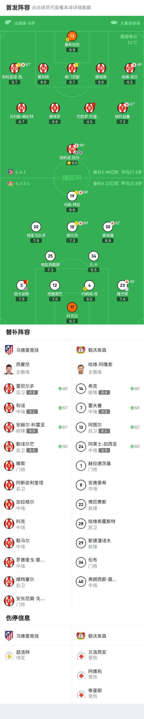 第45+1分钟,穆杰莱传中,因卡皮耶头球破门,勒沃库森1-0马竞