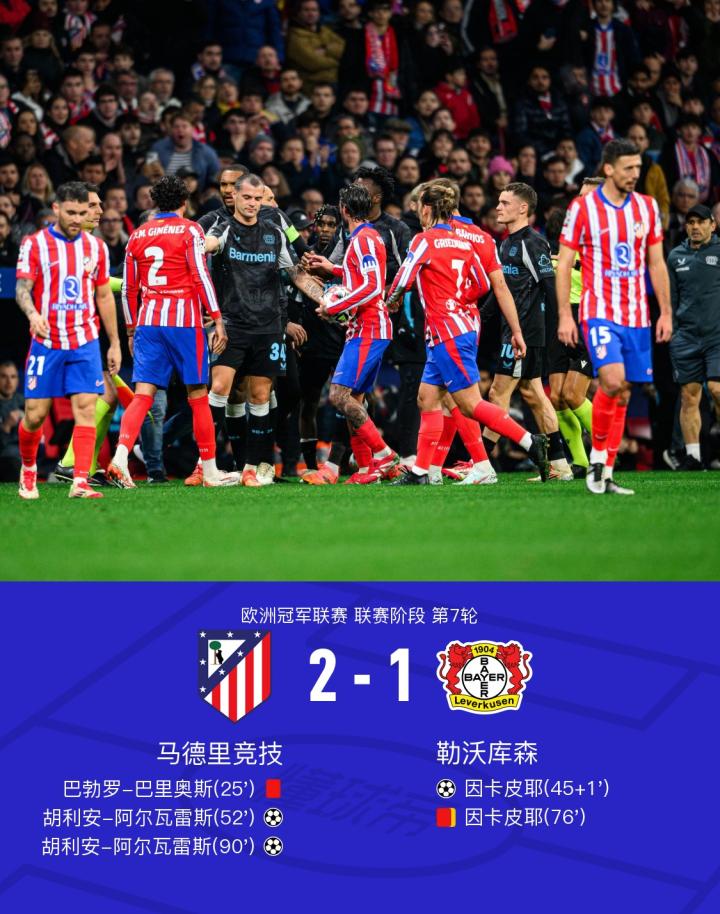 十人马竞2-1逆转十人勒沃库森,阿尔瓦雷斯双响+绝杀
