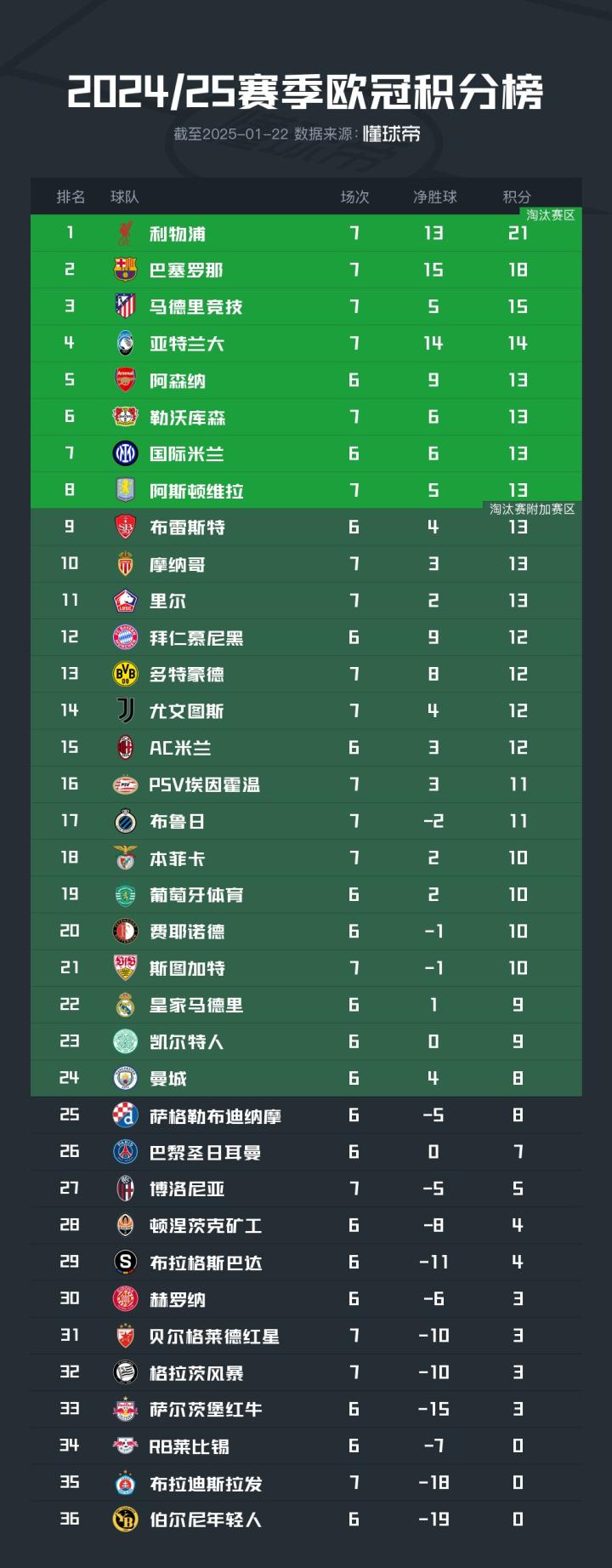 2024-25赛季欧冠联赛阶段第7轮结束了第一个比赛日的较量,利物浦和巴塞罗那提前晋级欧冠16强,又有三队提前被淘汰。