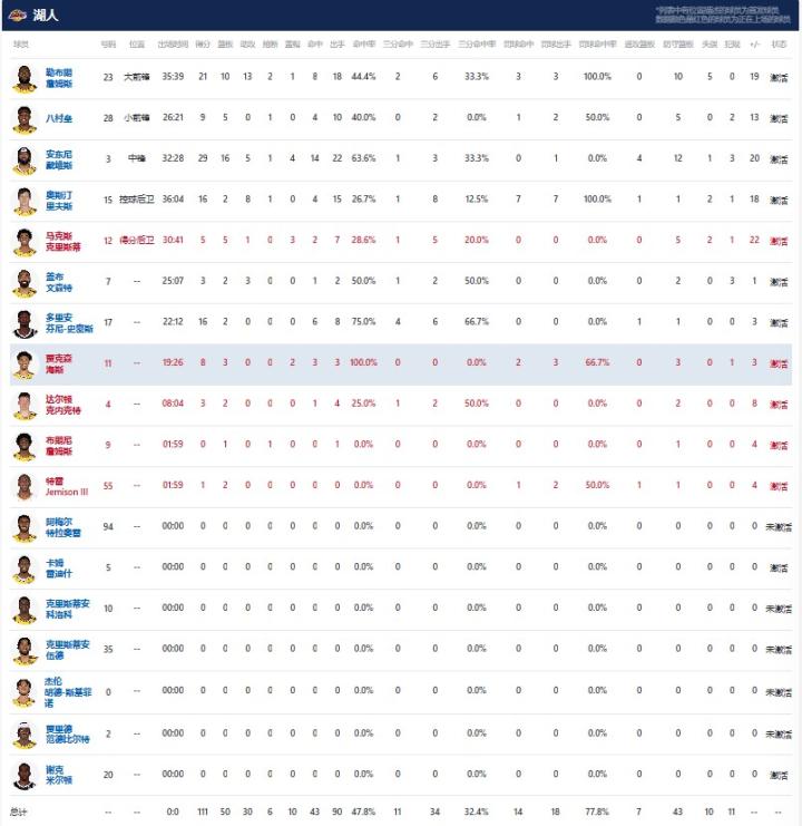 洛杉矶湖人安东尼-戴维斯29分16板5助1断4帽,詹姆斯21分10板13助2断1帽,芬尼-史密斯16分2板;