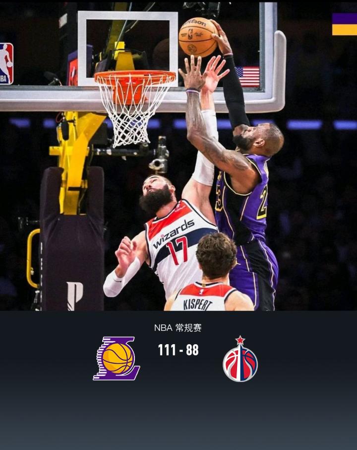 第四节,开节奇才基斯珀特三分追至9分分差,但随后湖人一波8-0将分差再度拉大至17分,奇才进攻端依旧乏力无力反扑,湖人继续保持17分上下领先,最后2分钟双方相继换下主力,湖人布朗尼登场1中0拿到1板1断,最终湖人111-88战胜奇才。