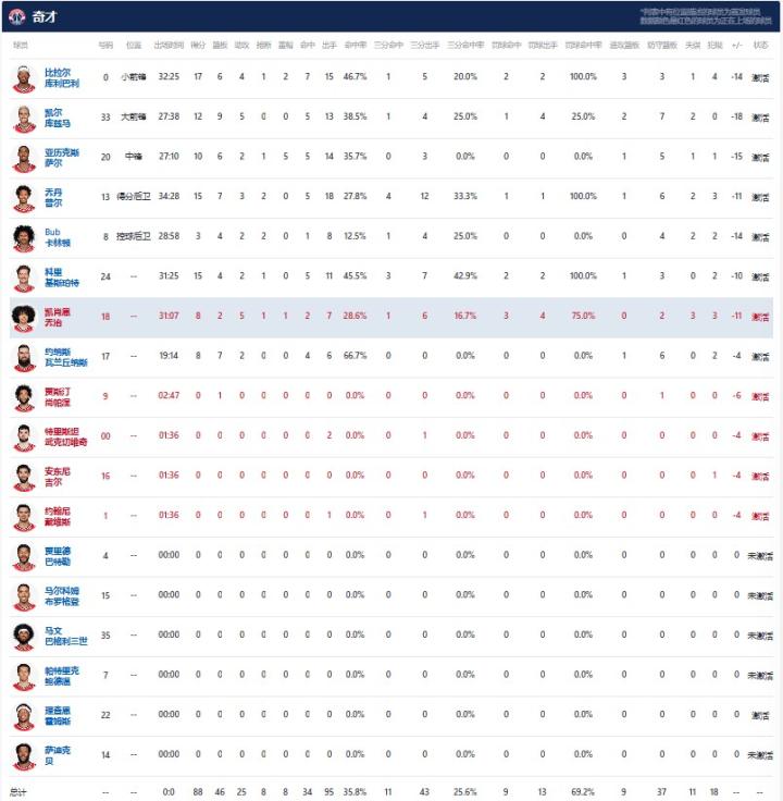 华盛顿奇才库利巴利17分6板4助1断2帽,普尔15分7板3助2断,基斯珀特15分4板2助1断。