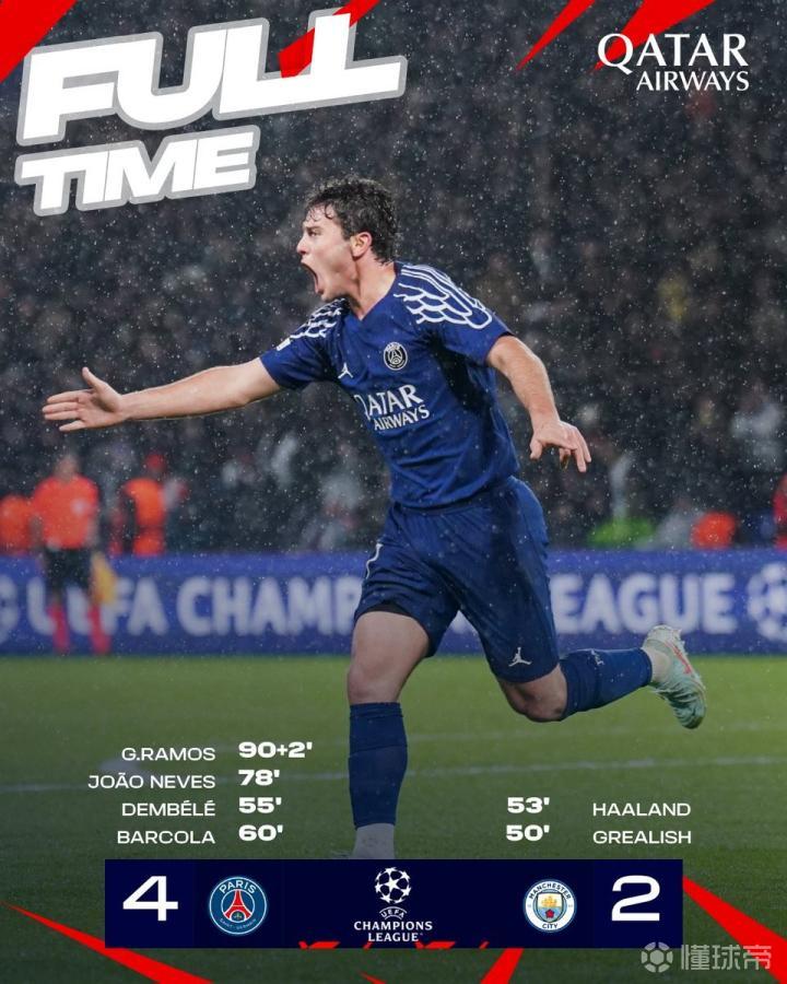 对曼城让二追四,巴黎队史首次在欧冠单场落后两球完成逆转