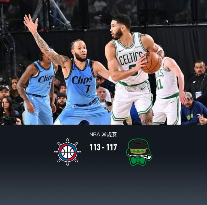 凯尔特人117-113加时险胜残阵快船,塔图姆24+7+8,琼斯29分