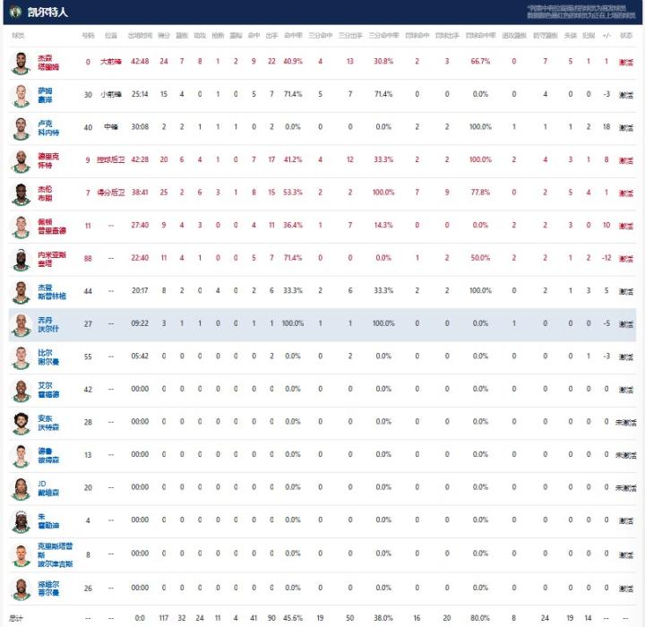波士顿凯尔特人杰伦-布朗25分2板6助,塔图姆24分7板8助,怀特20分6板4助。