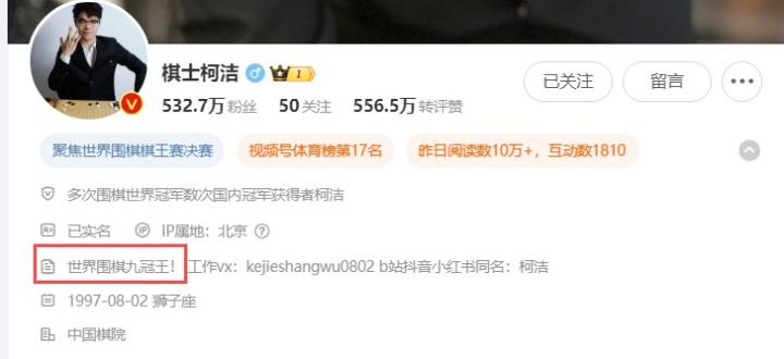 因裁判判罚无缘LG杯冠军,柯洁在微博简介中加上“世界围棋九冠王”