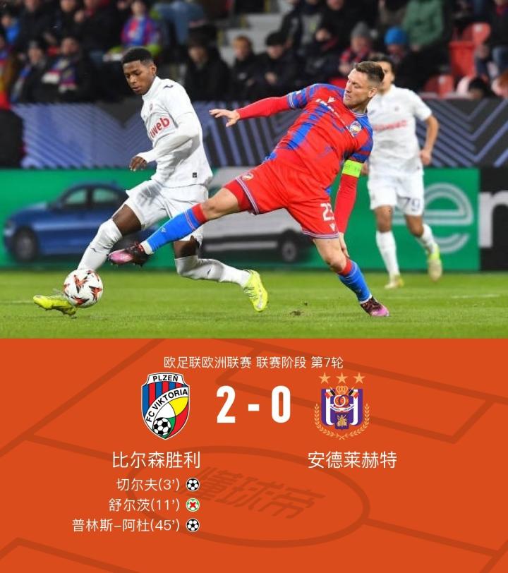比尔森胜利2-0安德莱赫特,切尔夫建功,普林斯-阿杜锦上添花
