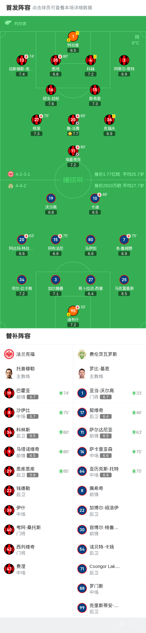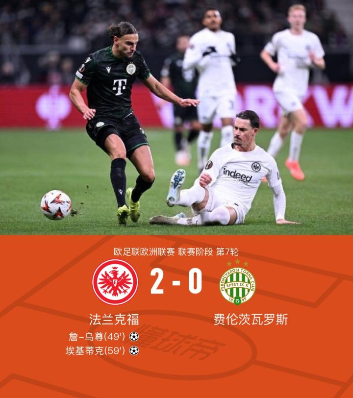 在欧足联欧洲联赛的较量中,法兰克福迎战费伦茨瓦罗斯。比赛中,法兰克福的詹-乌尊率先打破僵局,随后埃基蒂克再下一城,展现了球队的强大攻击力。最终,法兰克福以2-0的比分战胜费伦茨瓦罗斯,取得了比赛的胜利。