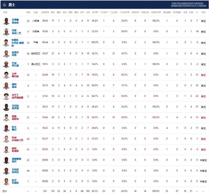金州勇士斯蒂芬-库里21分4板7助,昆顿-波斯特20分4板3助,吉-桑托斯19分7板1助;