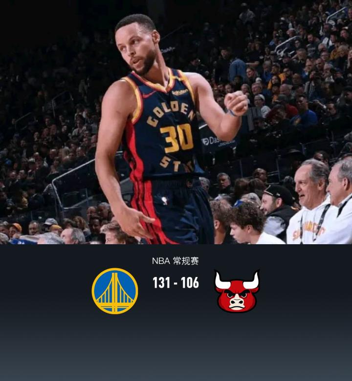 第四节,勇士延续势头继续三分雨领先至20分以上,随后公牛拉文持续造杀伤罚球止血,但勇士延续三分手感,随着库里三分命中,分差来到26分,后半节双方收兵换下主力,最终勇士131-106战胜公牛。