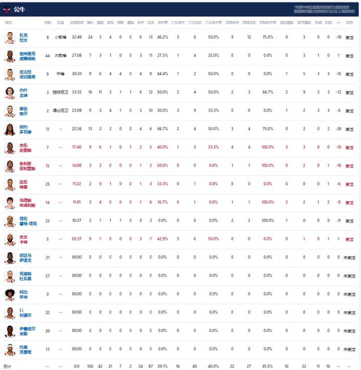 芝加哥公牛扎克-拉文24分3板4助,约什-吉迪16分11板3助,多森姆13分2板2助。