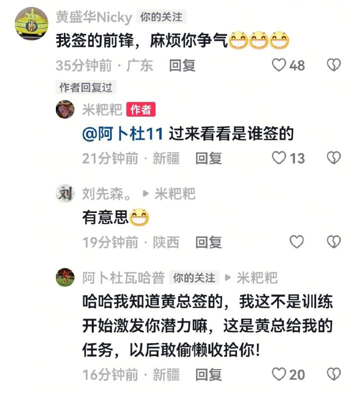 阿卜杜瓦哈普幽默回复:“哈哈我知道黄总签的,我这不是训练开始激发你潜力嘛,这是黄总给我的任务,以后敢偷懒收拾你!”