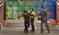 小品的结尾,三人共同唱起:向前进!向前进!女足要责任大,男足要翻身,古有花木兰替父从军,今有女足姑娘争光为人民……