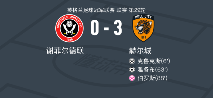 赫尔城3-0大胜谢菲尔德联,雅各布建功,克鲁克斯破门