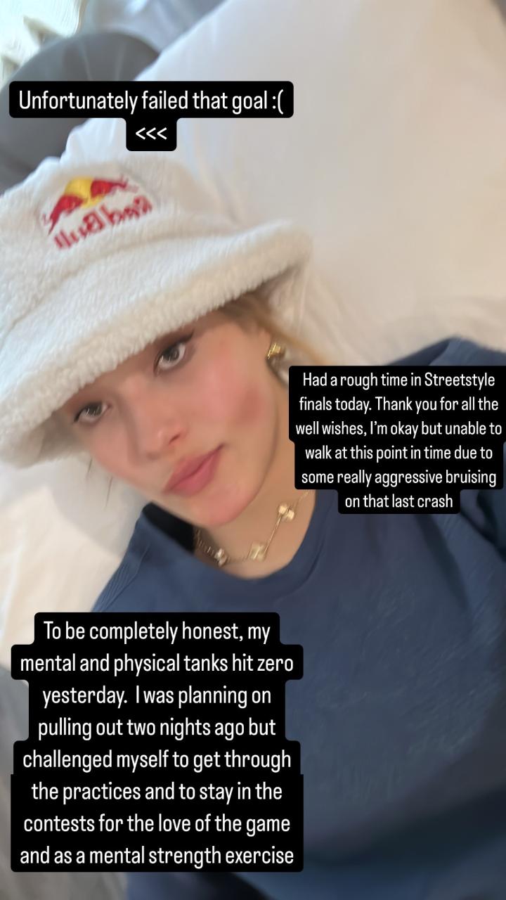 谷爱凌表示:“今天在Street Style的比赛中经历了一段艰难的时期。谢谢大家的祝福,我还好,但由于最后一次摔倒造成了严重的挫伤,现在还不能走路。”