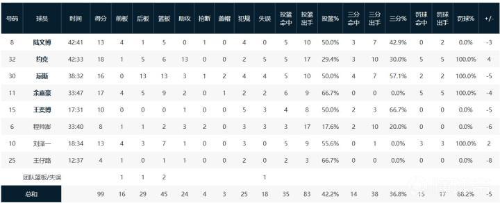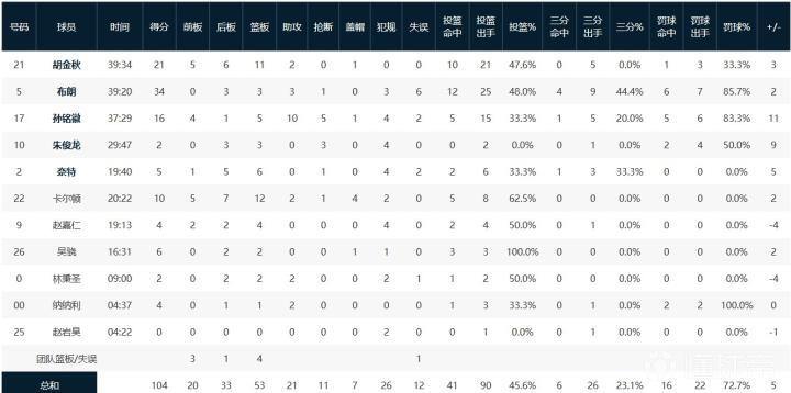 浙江方兴渡巴里-布朗34分3板3助,胡金秋21分11板2助,孙铭徽16分5板10助5断;