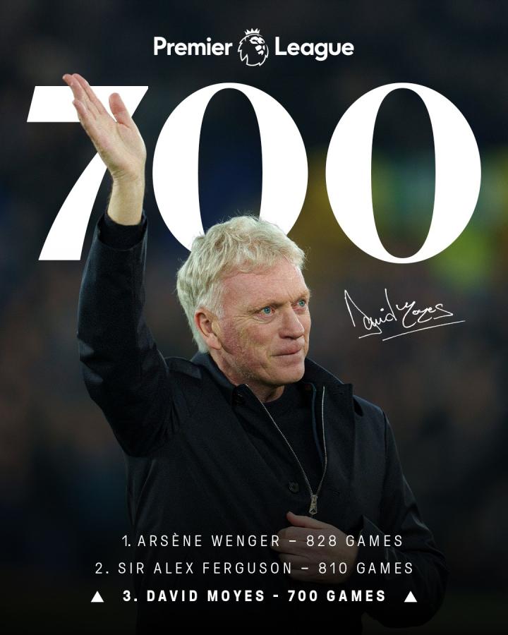 埃弗顿主帅莫耶斯迎来了执教英超700场的里程碑,他也成为了弗格森爵士与温格教授后,英超史上第三位达成执教700场里程碑的主教练。