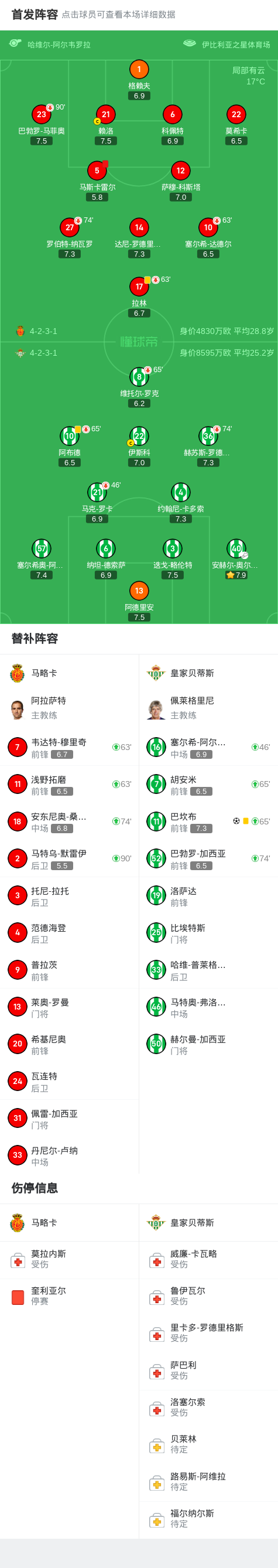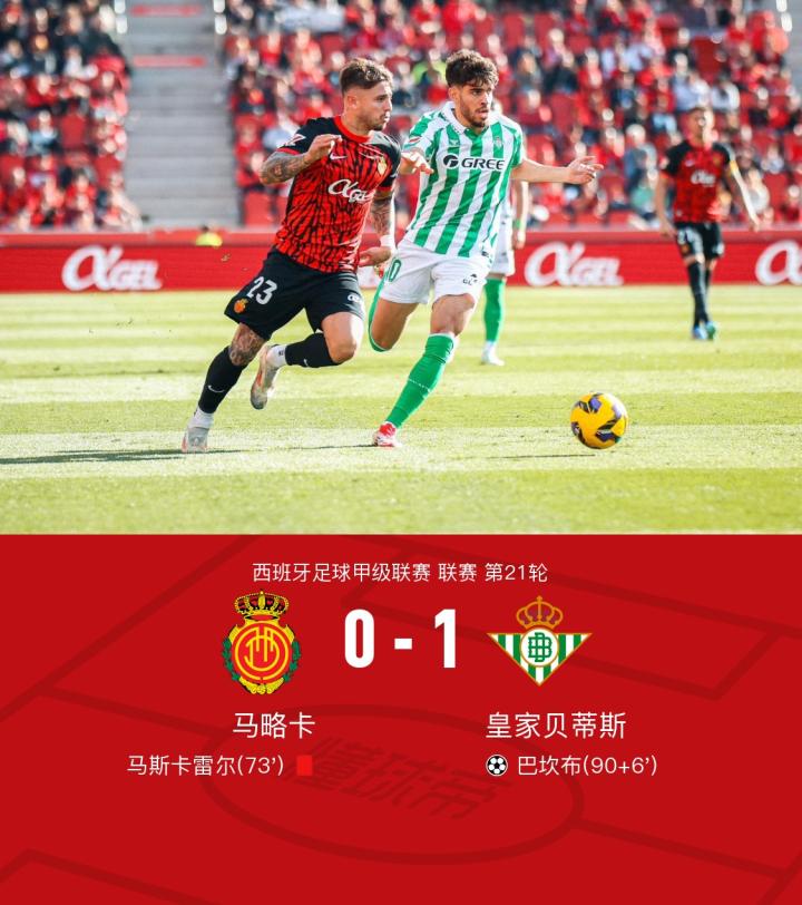 皇家贝蒂斯客场1-0战胜十人马略卡,巴坎布补时绝杀,马斯卡雷尔染红