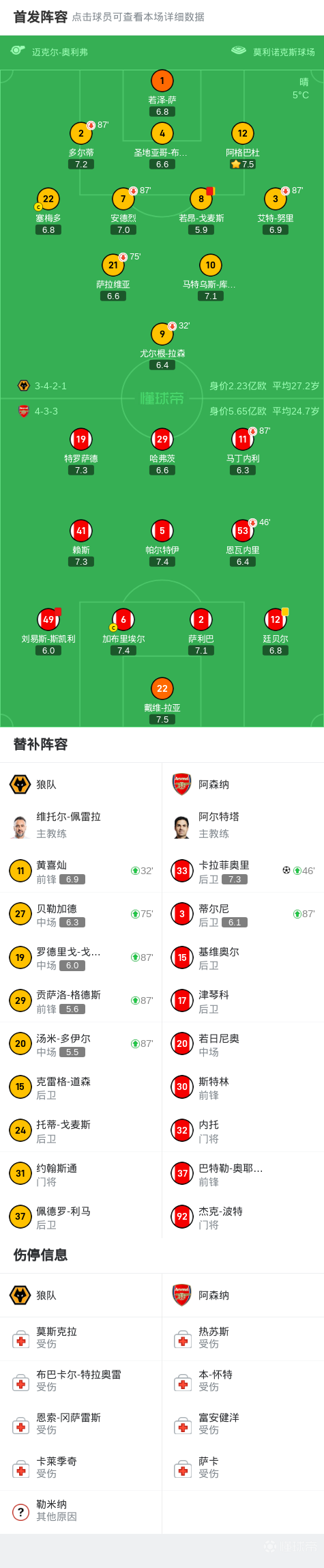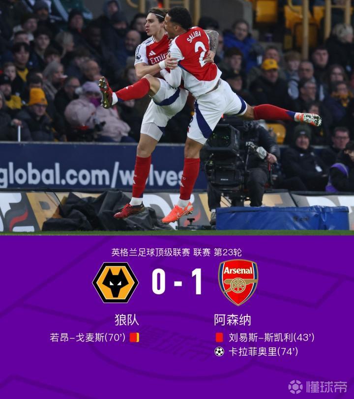 在英格兰足球顶级联赛第23轮的较量中,狼队坐镇主场迎战阿森纳。上半场萨拉维亚凌空抽射打高,哈弗茨屡次头球造险,斯凯利直红下场,下半场哈弗茨头球再次顶高,若昂-戈麦斯踩踏染黄,两黄变一红被罚下,卡拉菲奥里低射破门。最终,阿森纳以1比0战胜狼队,成功带走三分。