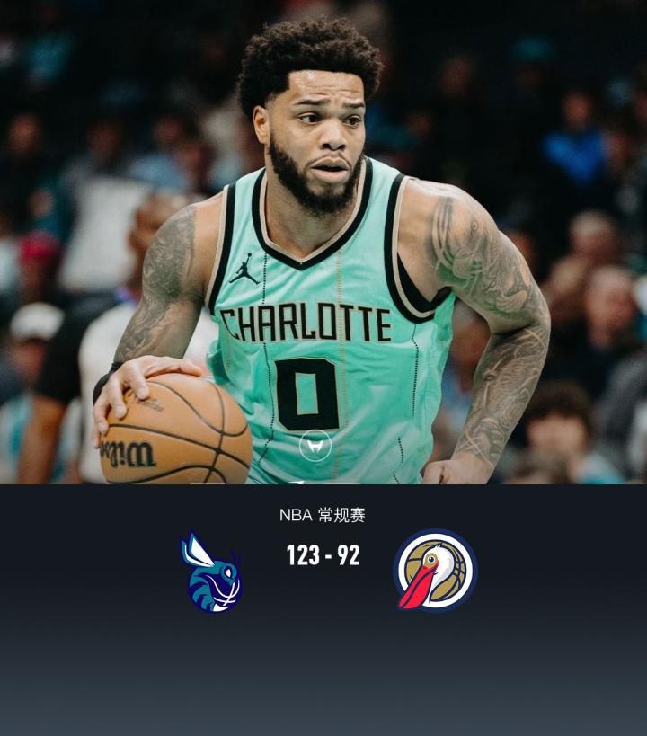 第四节黄蜂米西奇拿下6分,鹈鹕锡安-威廉森拿下13分,最终黄蜂123-92战胜鹈鹕
