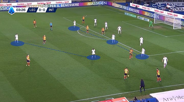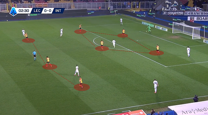 (图)做客德尔玛雷,国际米兰开场后摆出全员防守的姿态,莱切有7名球员深入前场展开压迫。