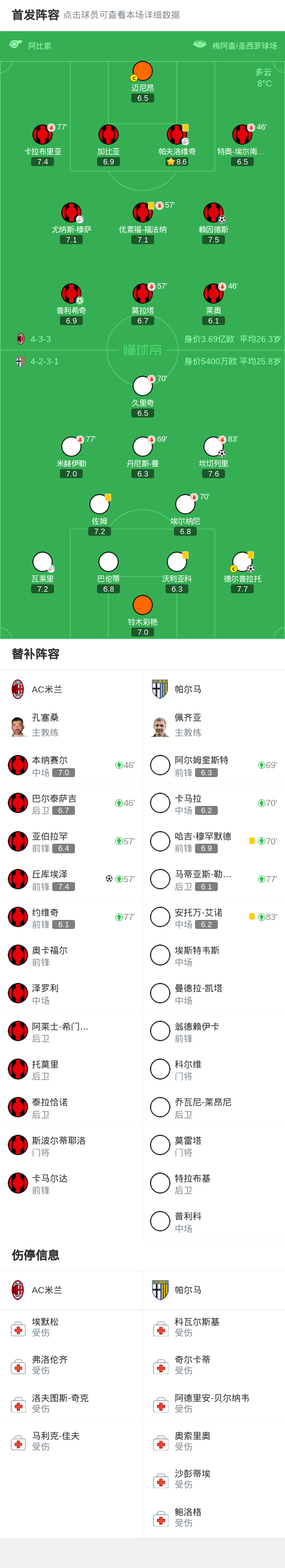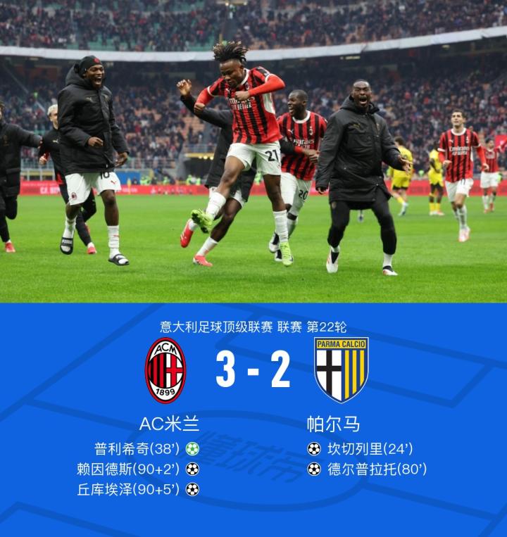 在意大利足球顶级联赛第22轮的较量中,AC米兰坐镇主场迎战帕尔马。上半场坎切列里建功,之后铃木彩艳推倒帕夫洛维奇送点,普利希奇点射扳平。下半场本纳赛尔出球被断,德尔普拉托破门,帕尔马再次领先,补时阶段赖因德斯、丘库埃泽各入一球完成绝杀,最终米兰3-2战胜帕尔马。