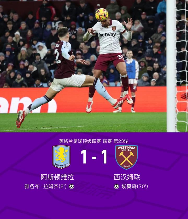 在英格兰足球顶级联赛第23轮的较量中,阿斯顿维拉坐镇主场迎战西汉姆联。比赛中,阿斯顿维拉的雅各布-拉姆齐在队友沃特金斯的助攻下成功破门,为主队先拔头筹。随后,西汉姆联的埃莫森在埃德松-阿尔瓦雷斯的精妙传球下扳平比分。最终,双方以1-1握手言和,未能分出胜负。