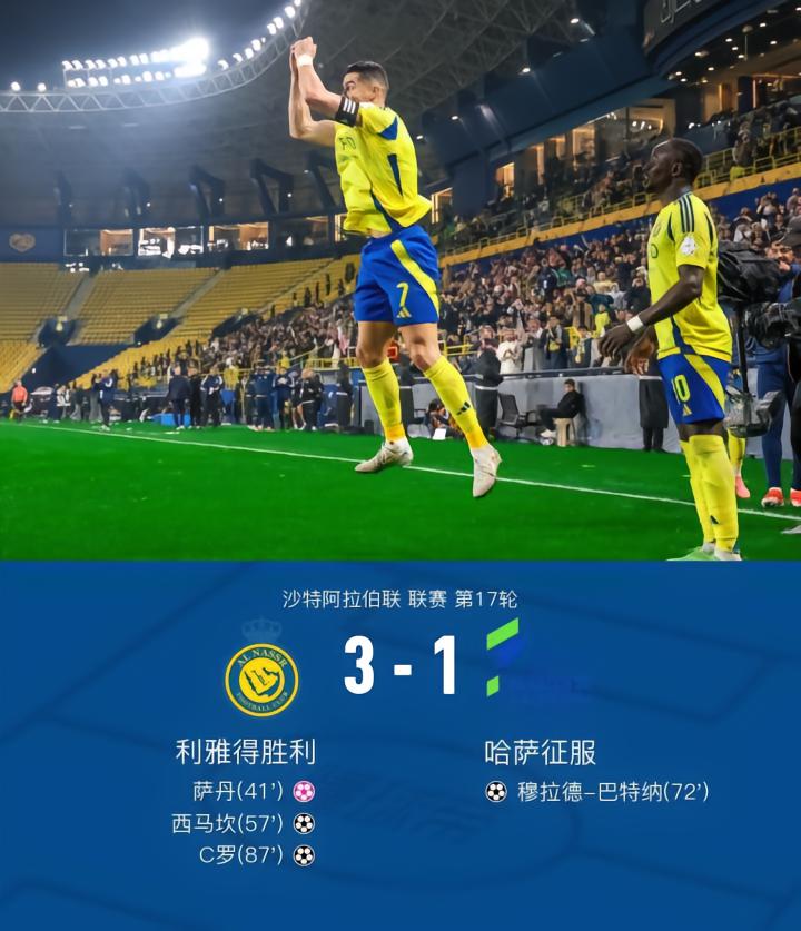 在沙特阿拉伯联赛第17轮的较量中,利雅得胜利坐镇主场迎战哈萨征服。上半场马内、C罗进球均被吹无效,之后安热洛传球造成萨丹乌龙。下半场安热洛开出任意球,西马坎强力头球破门,之后本托禁区内玩火送礼,巴特纳破门,比赛尾声马内送助攻,C罗后点轻松破门,补时阶段C罗小角度劲射破门,但此前队友越位,进球无效。最终利雅得胜利3-1战胜哈萨征服。